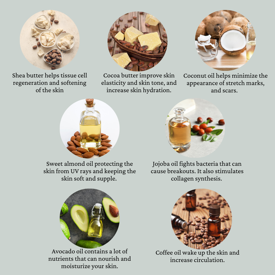 Ingredients: Shea Butter, Cocoa Butter, Coconut Oil, Sweet Almond Oil, Shea Oil, Jojoba Oil, Avocado Oil, Coffee Essential Oil,