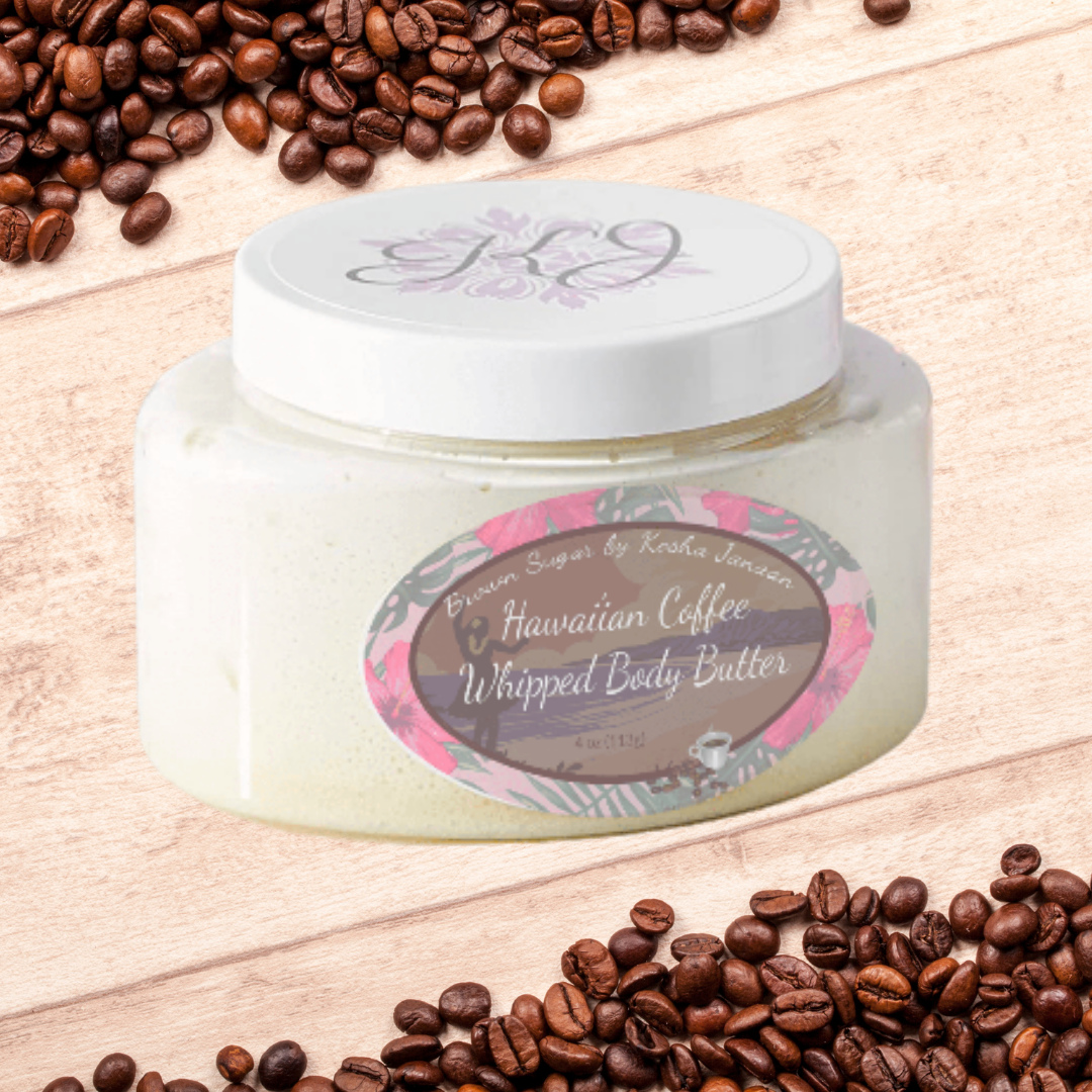 This is my signature skin-loving whipped body butter with coffee oil. This gives the butter the caffeine equivalent of 1 to 2 cups of coffee to wake up the skin and increase circulation!